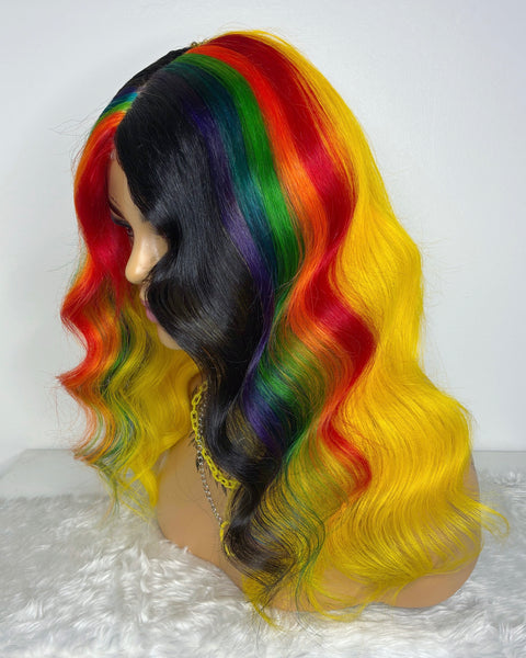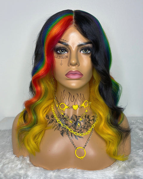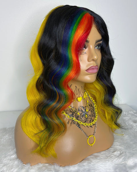 Colour: yellow with black chunky streaks and rainbow panels