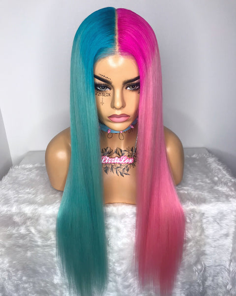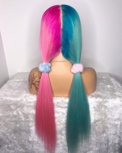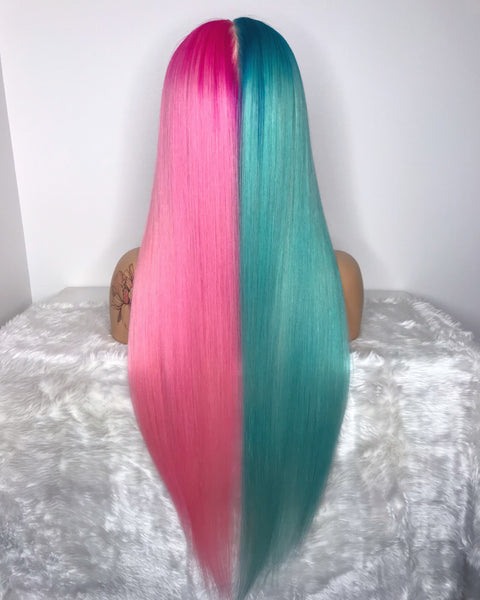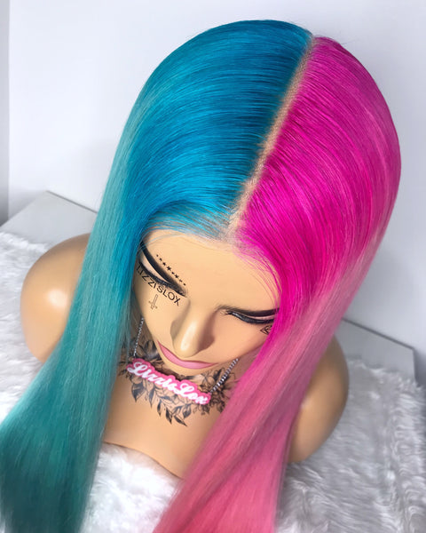Colour: 1/2 pastel blue with bright blue roots 1/2 pastel pink with hot pink roots